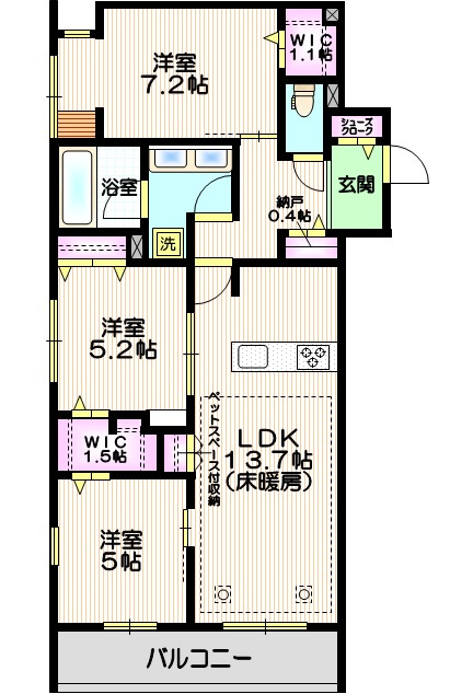 LDK 13.7帖/洋室 7.2帖/洋室 5.2帖/洋室 5.0帖/その他 1.5帖/その他 1.1帖/S 0.4帖 - 向き