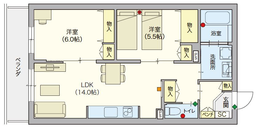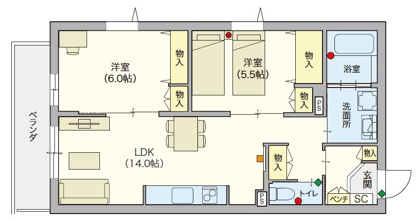 LDK 14.0帖/洋室 6.0帖/洋室 5.5帖
